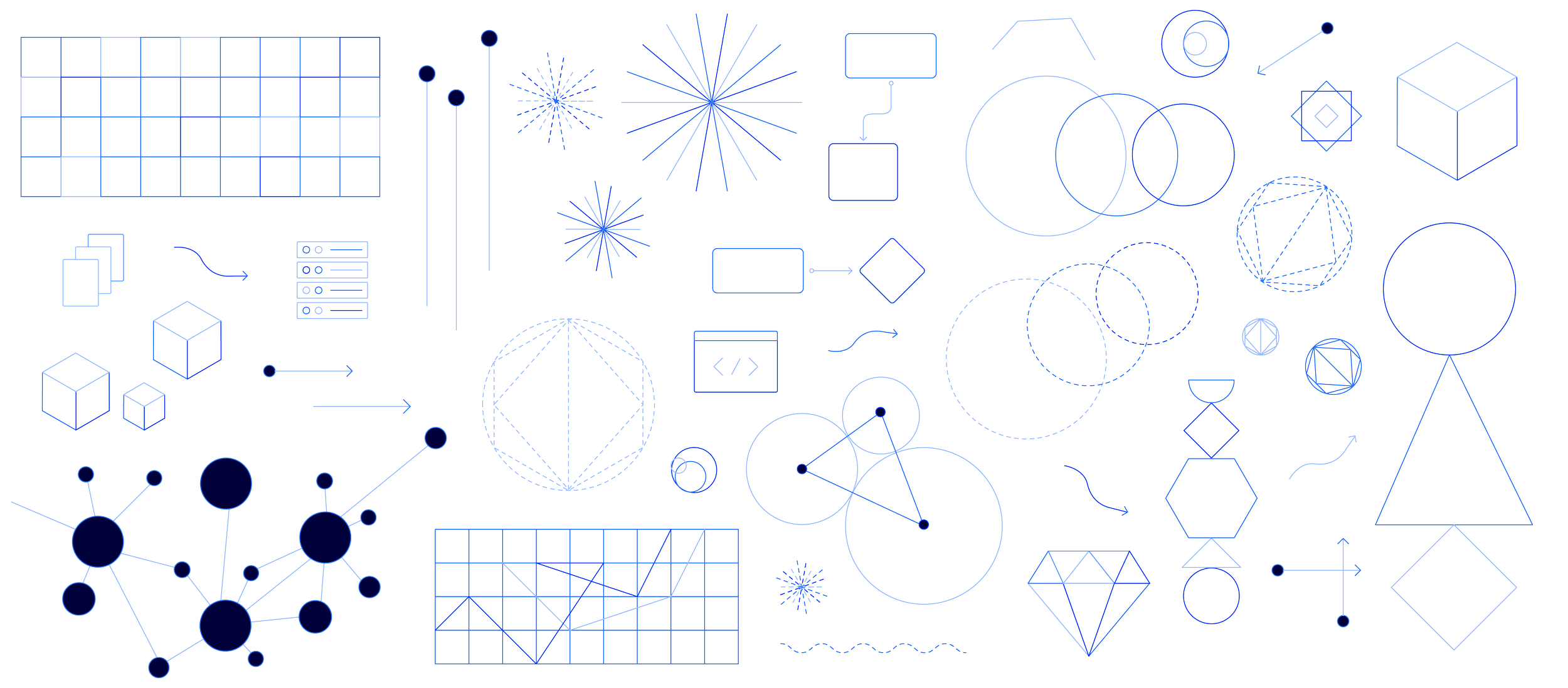 I designed a geometric visual system in two modes: filled illustrations for instructional clarity and a stroked, blueprint-like treatment for title cards. Both draw from the same shapes and structures, allowing the system to scale quickly across the course.